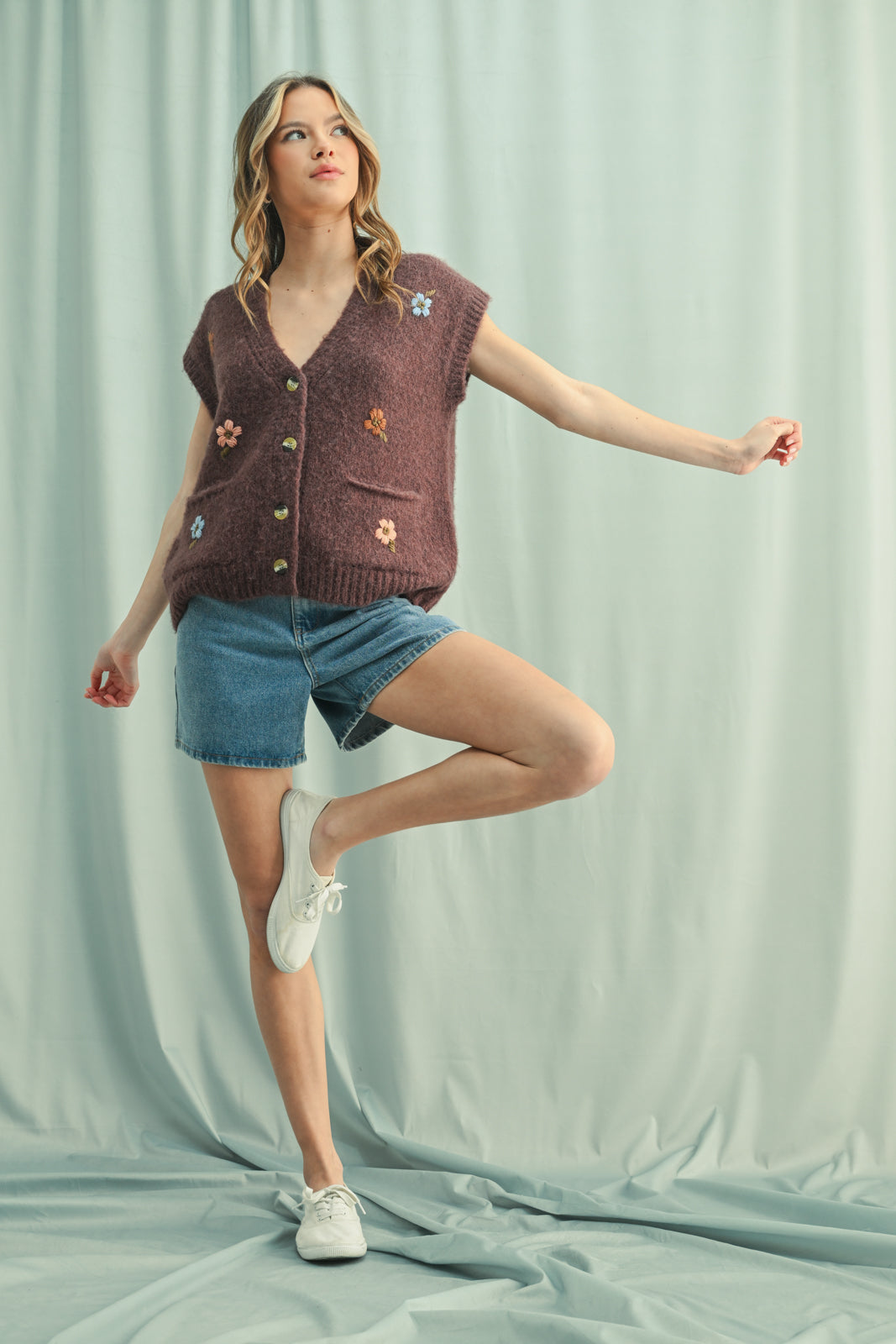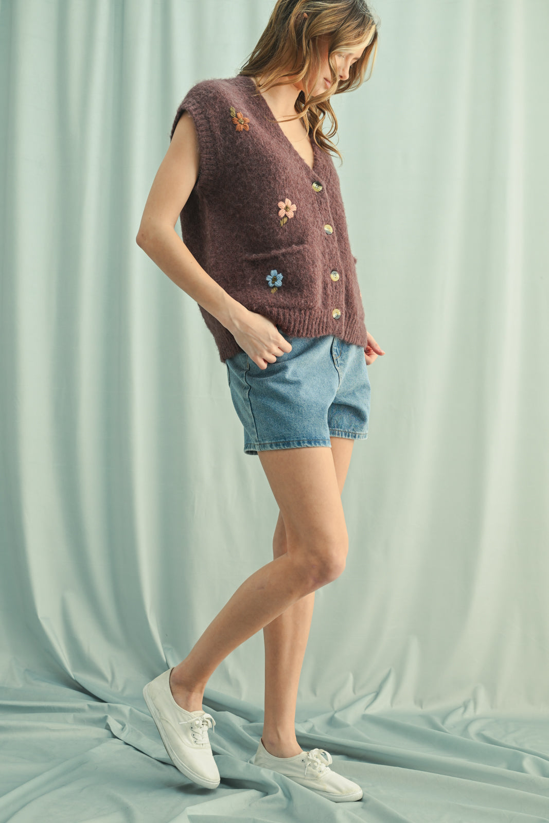BRUSHED FLORAL EMBROIDERED VEST SWEATER